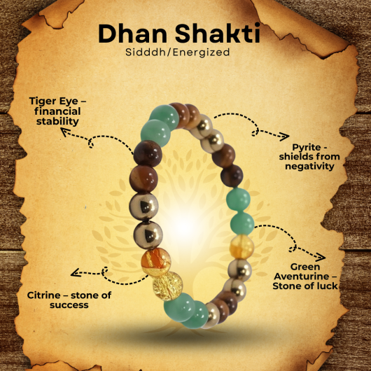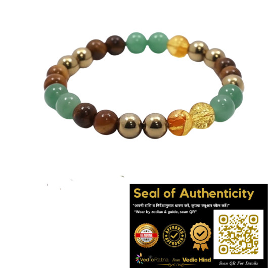 यह ब्रेसलेट उन लोगों के लिए बनाया गया है जो आर्थिक रूप से सशक्त बनना चाहते हैं। इसमें समृद्धि के रत्न (सिट्रीन, पाइराइट), सौभाग्य के रत्न (ग्रीन एवेंचुराइन), साहस और स्थिरता (टाइगर आई और वुड जैस्पर) का संयोजन है। ये सभी मिलकर आपकी आर्थिक ऊर्जा को जाग्रत और संतुलित करते हैं।