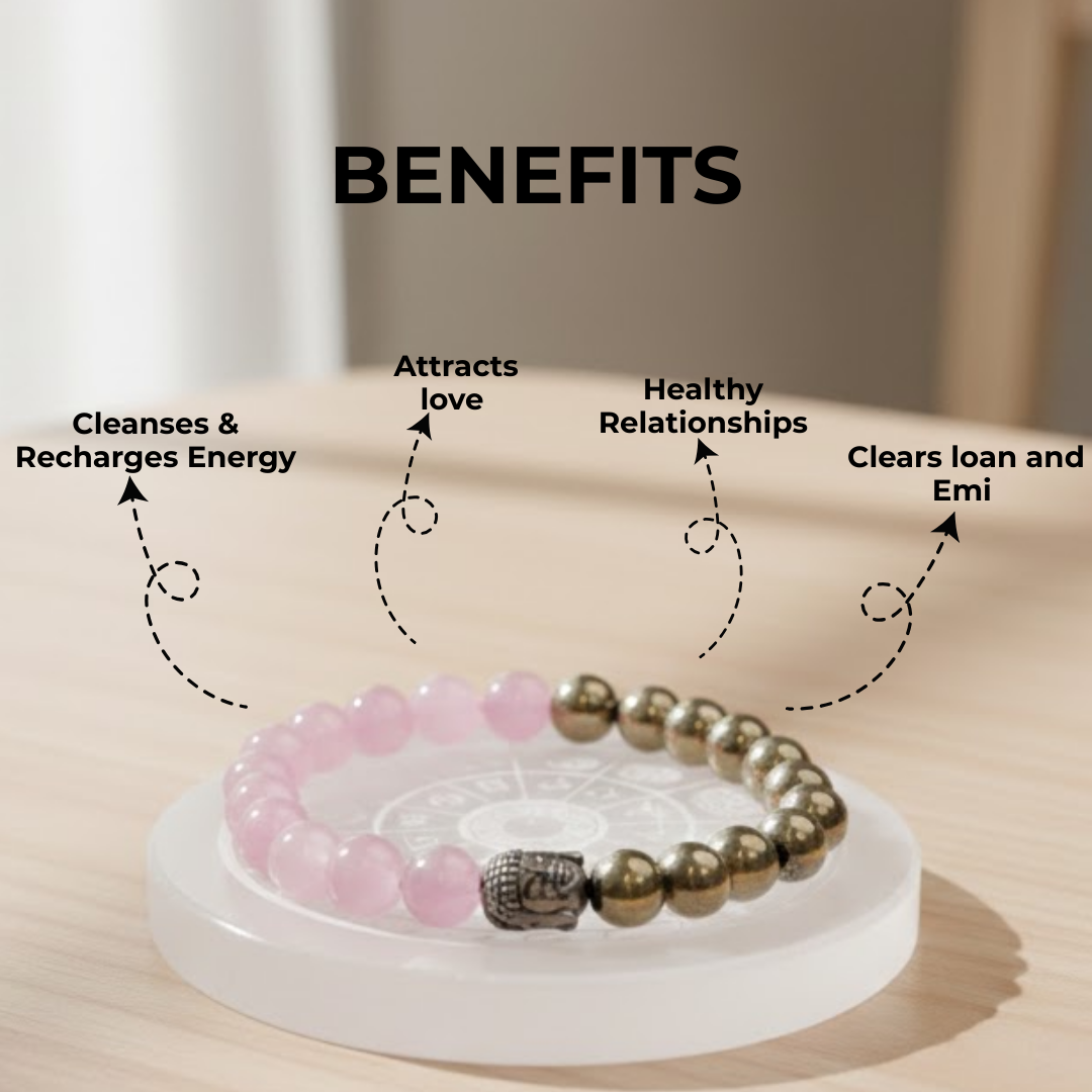 प्रेम और समृद्धि का एक परफ़ेक्ट मिश्रण। रोज़ क्वार्ट्ज भावनात्मक हीलिंग लाता है, गोल्डन बीड्स धन आकर्षित करते हैं, और सेलेनाइट प्लेट ब्रेसलेट को शुद्ध और ऊर्जा से भरपूर रखती है—ताकि यह रोज़ आपकी आभा को ऊँचा उठाने के लिए तैयार रहे।