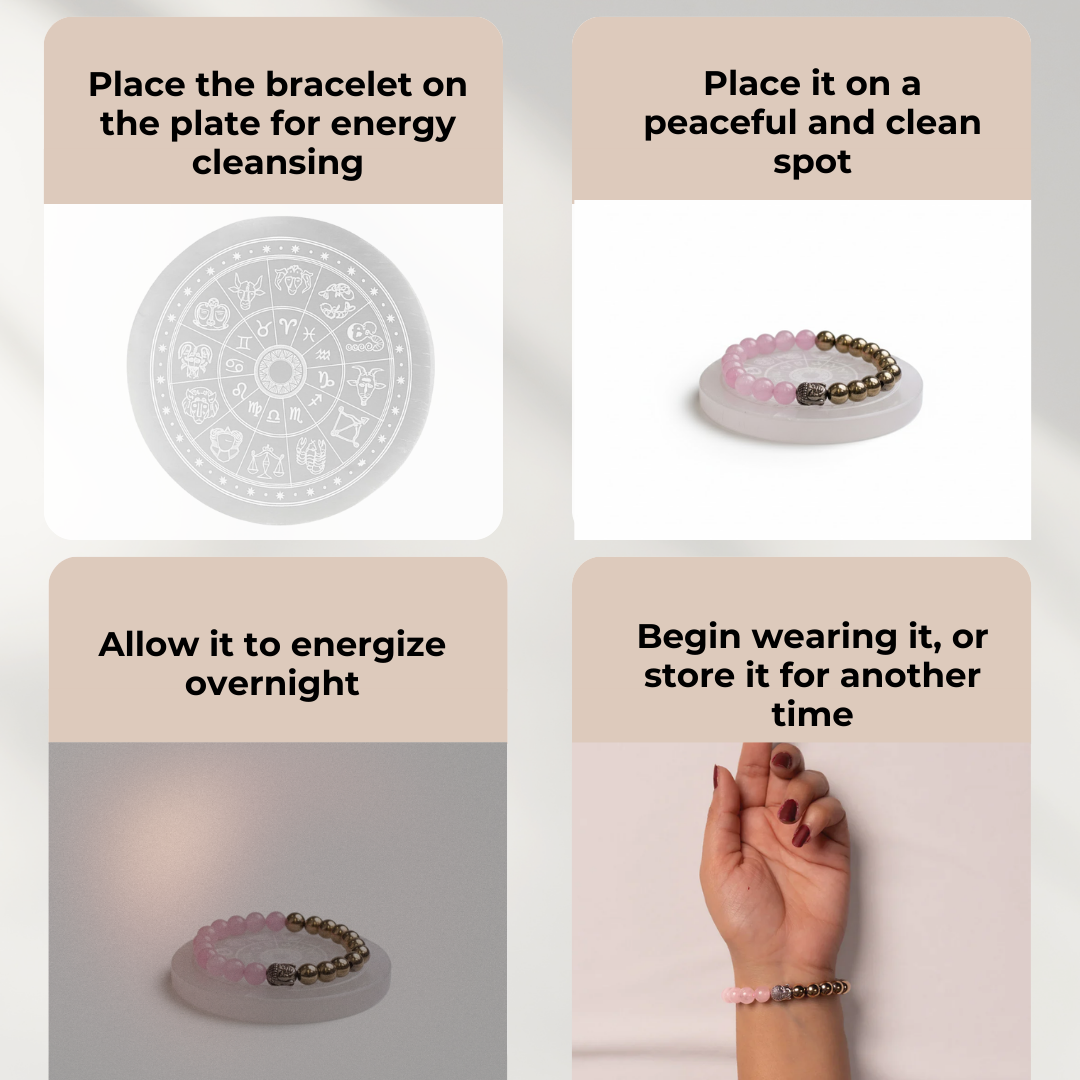 The Selenite Plate naturally cleanses and recharges the bracelet: