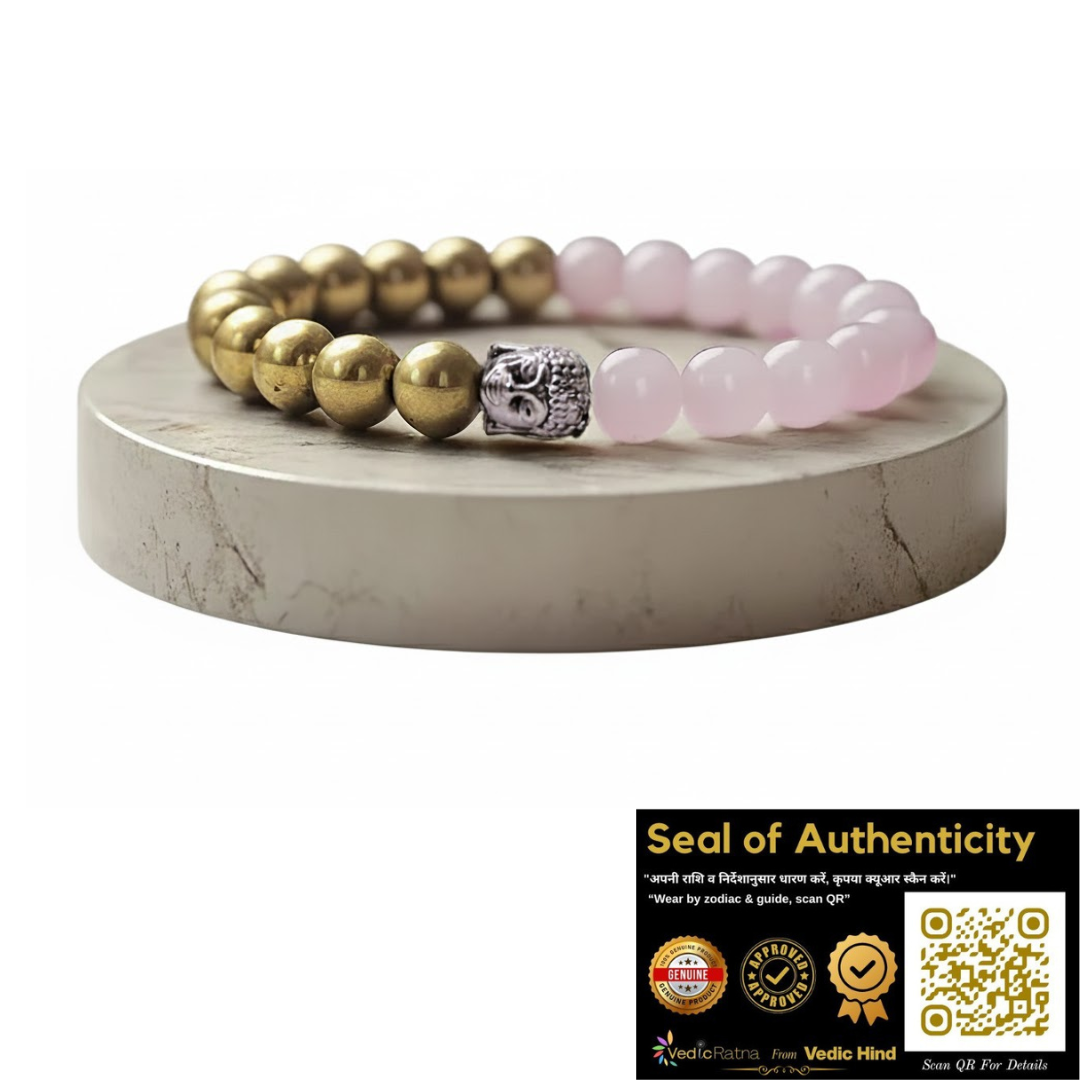 This powerful combination of Rose Quartz and Pyrite brings together the energies of love and abundance. Rose Quartz opens your heart to attract genuine love, heal emotional wounds, and enhance relationships. Pyrite acts as a magnet for prosperity and confidence, helping you attract wealth and new opportunities. Together, they balance emotional and financial energies, promoting overall happiness and success.