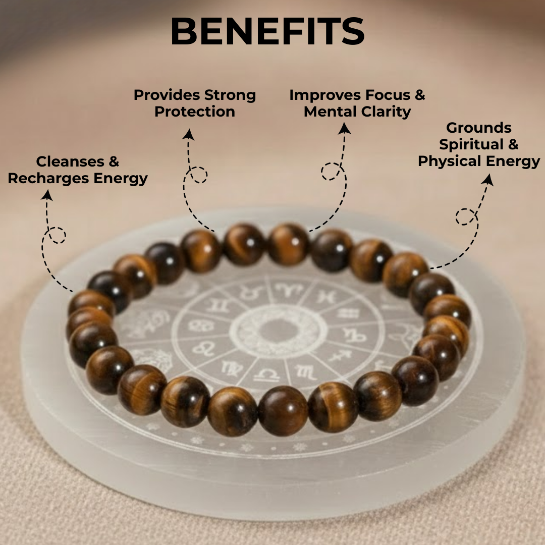 Wear the Tiger Eye bracelet on your left hand for daily protection, confidence, and focus. Recharge it by placing it on the Selenite Plate for 15–30 minutes to cleanse negative energy and restore its natural power.